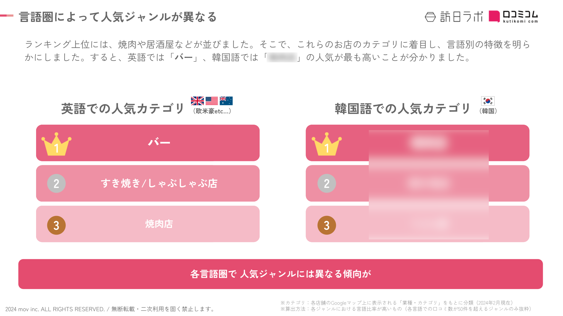 飲食店のカテゴリに着目してみると、英語では「バー」、韓国語では「◯◯◯◯◯◯◯」の人気が最も高いことが分かりました。