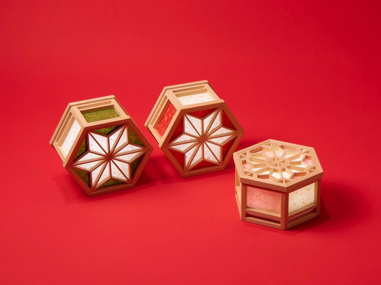 「組子細工」と唐から京都に伝わった紙細工「京からかみ」、そして現代の技術「LED」を合わせた木製のインテリア照明。あたたかな光が和紙を透し、美しい文様が部屋を華やかに彩り、私たちの暮らしを照らしてくれる。