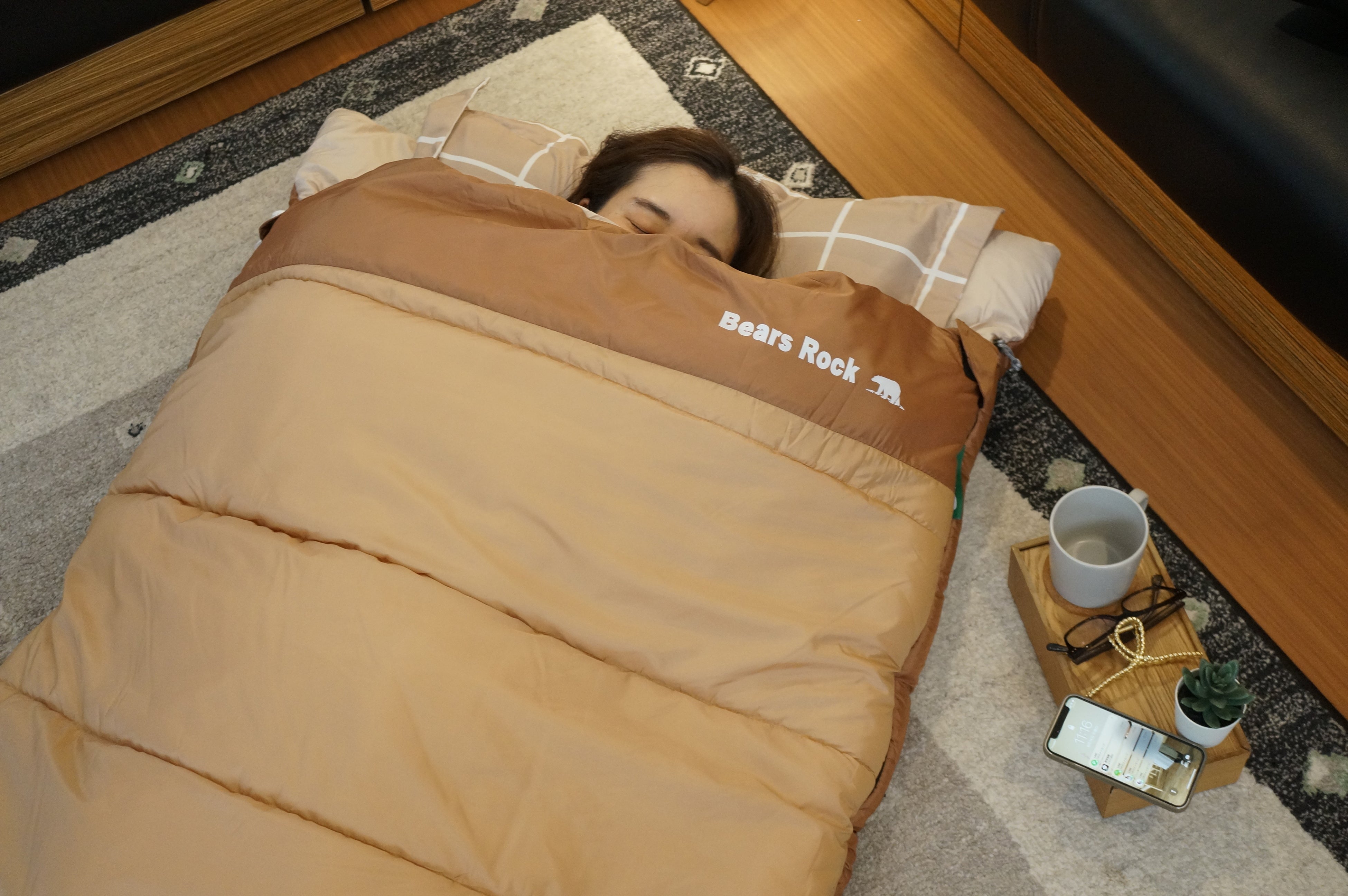 布団のようにふわふわで暖かく、寝袋と同じ中綿と生地を使っているため保温性に優れており、軽量でコンパクトに収納することができます。