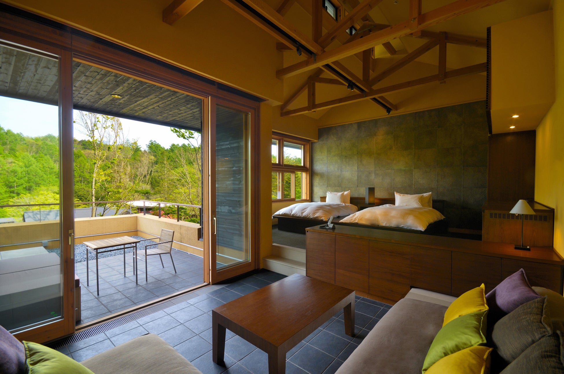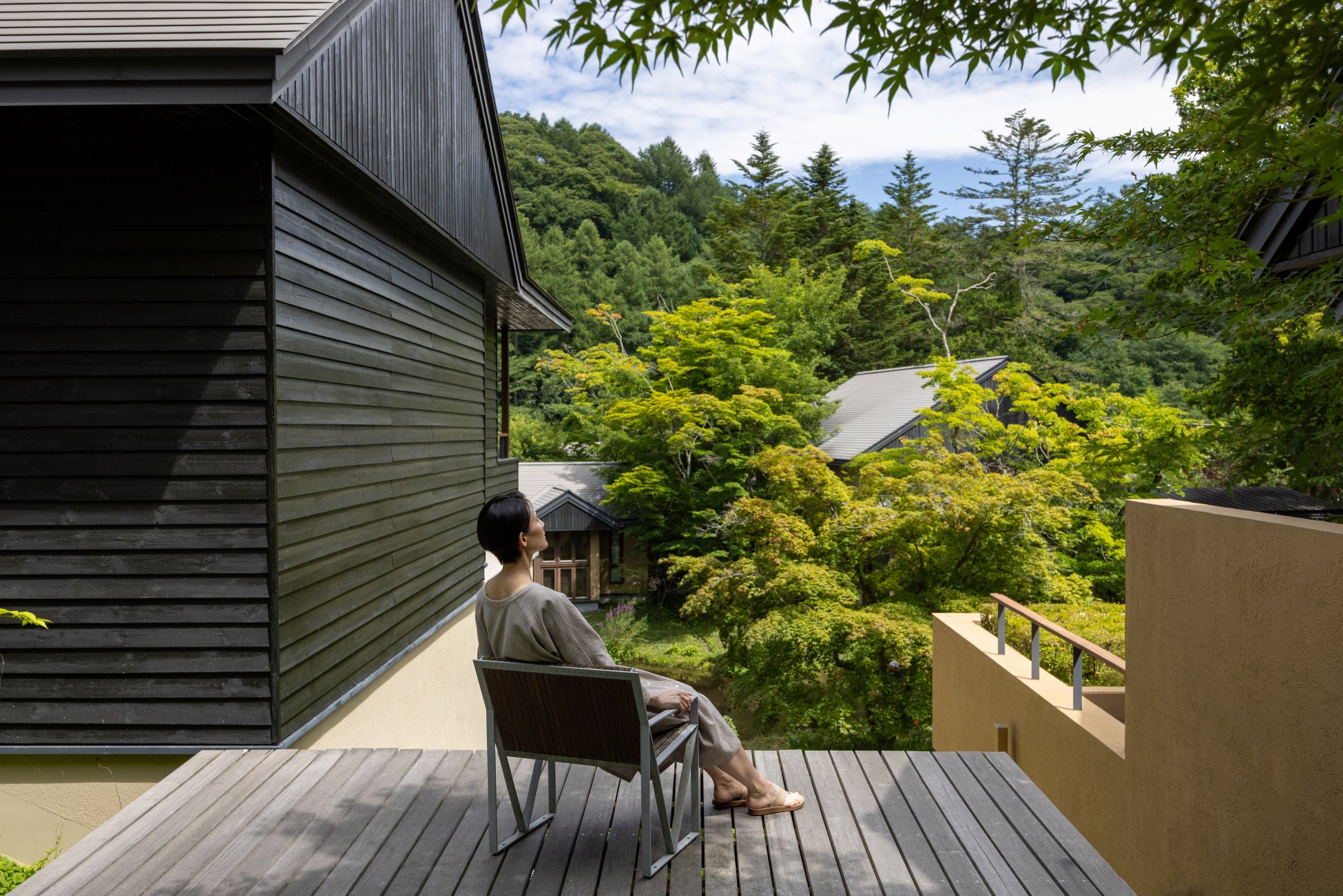 谷の集落に滞在する。離れの客室は水辺を囲み、部屋のテラスからは季節のうつろいが感じられます。「軽井沢野鳥の森」に面した豊かな自然環境にて、休息の時間を満喫できる滞在型の宿泊施設です。