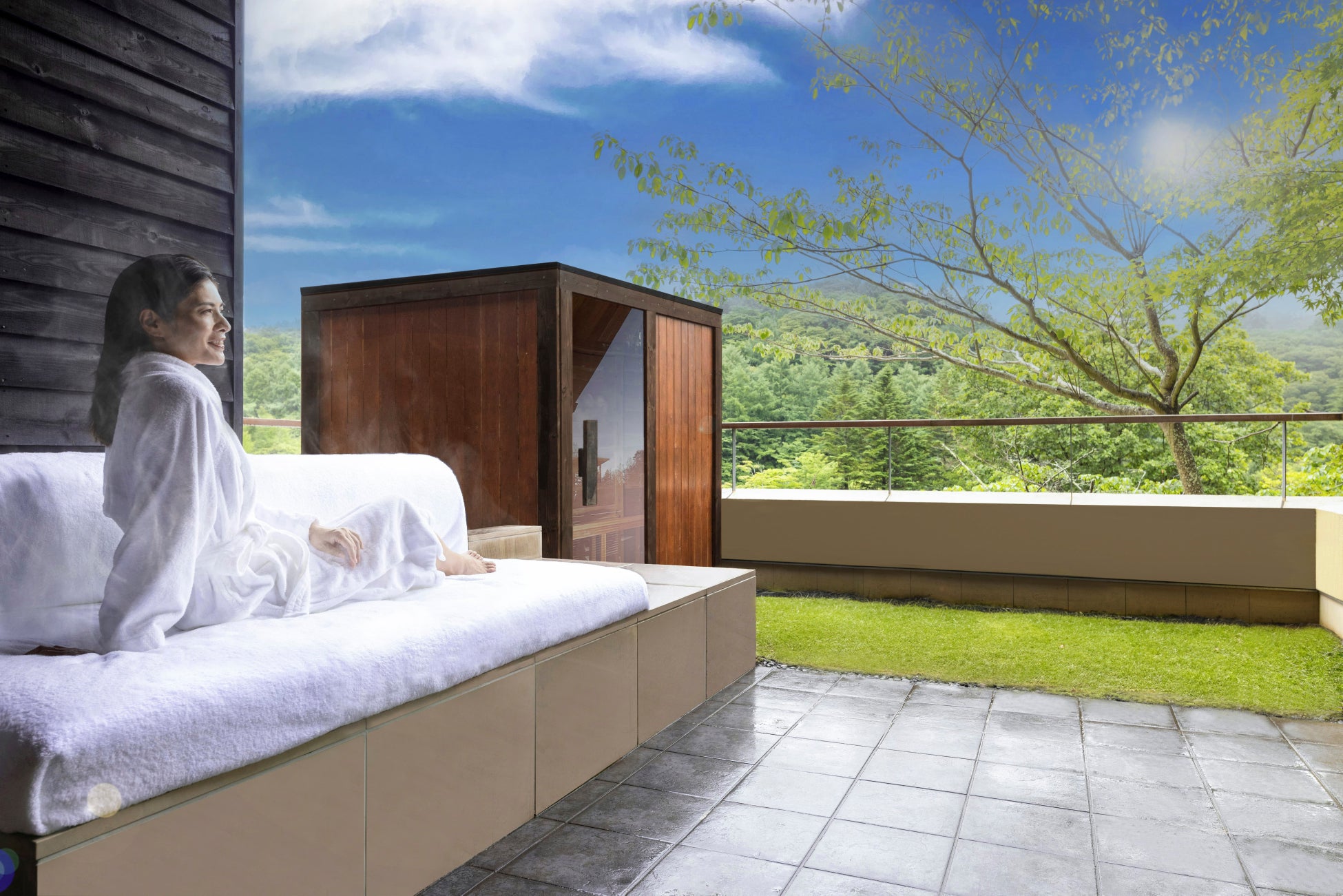 本プログラムでは、テラスに中温高湿のオリジナルのサウナボックスが設置された特別な客室を用意します。サウナは熱と蒸気によって体を深部から温める「ウェットサウナ」方式で、高湿の水蒸気を発生させる「ロウリュ」も可能です。また、外気浴を楽しめるよう、テラスにはグラビティチェアを設置します。テラスからは軽井沢野鳥の森を望める自然豊かな軽井沢の情景とともに、プライベートな空間で気兼ねなくゆったりと開放的な外気浴を楽しめます。さらに、星のや軽井沢ならではのランドスケープにて散策を満喫したり、集落内にある椅子に腰かけて外気浴を楽しむこともできます。夏の間も心地よい風が吹き渡る軽井沢で、瀬音や鳥の鳴き声を聞きながら、自然豊かな空間に身を任せます。客室風呂の水は浅間山の伏流水です。この水は軟水で皮膚刺激が少ないので、外気浴後にぬるめの温度で入浴することで乾燥しがちな肌をいたわることができます。