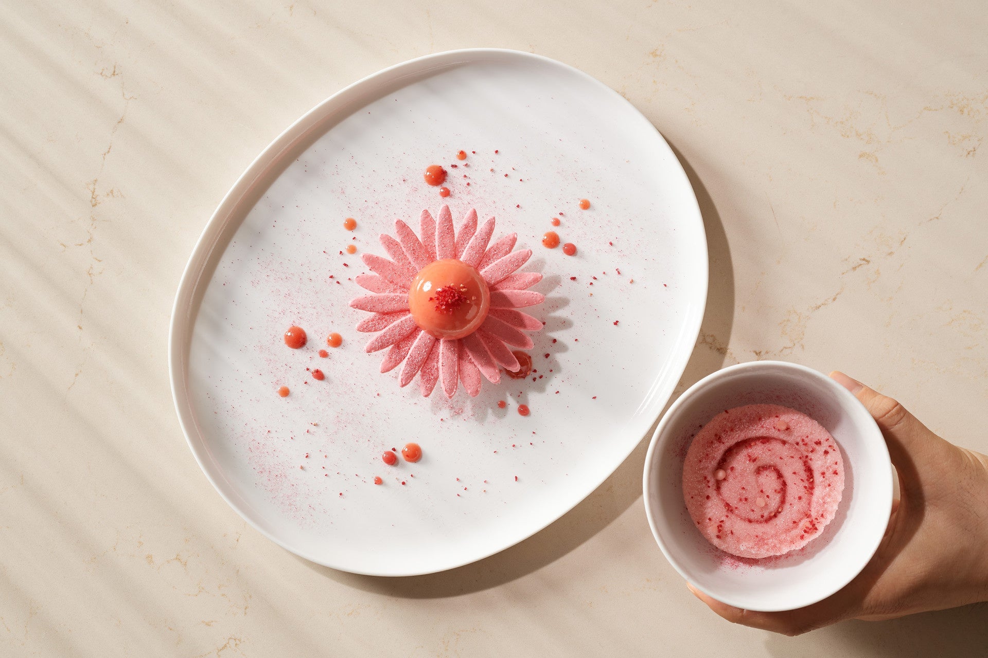 和の旨味にフランスの技術を合わせた軽やかで繊細なギヨームのお料理から引き継ぐミケーレのデザートは、同じく繊細でエレガント。合わせて、芸術家やアートから受けた感情をお皿に映しだす、「美と感性が宿ったデザート」とも評されております。