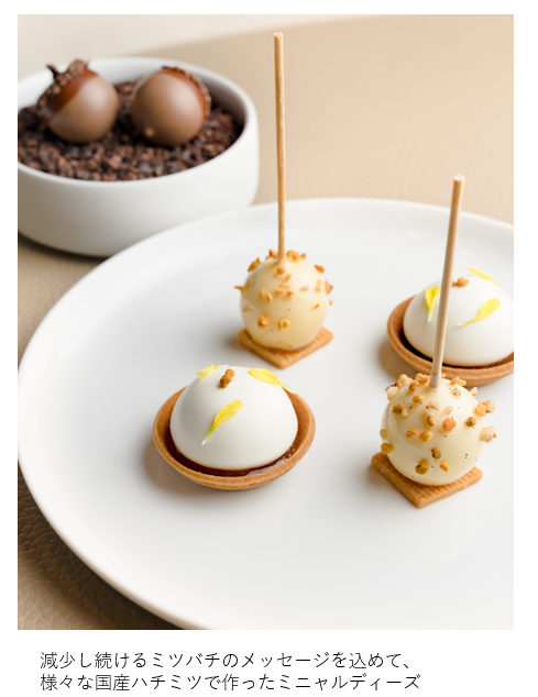 -国産食材: 流通の過程で生じる環境負荷の軽減を配慮しております。長年に渡って日本の食材を学び続けたミケーレのデザートで使われる食材は約95%が国産で、ミケーレ自身が日本各地を訪ね生産者様と食に対する姿勢をお話しながら、食材を取り寄せることもございます。
