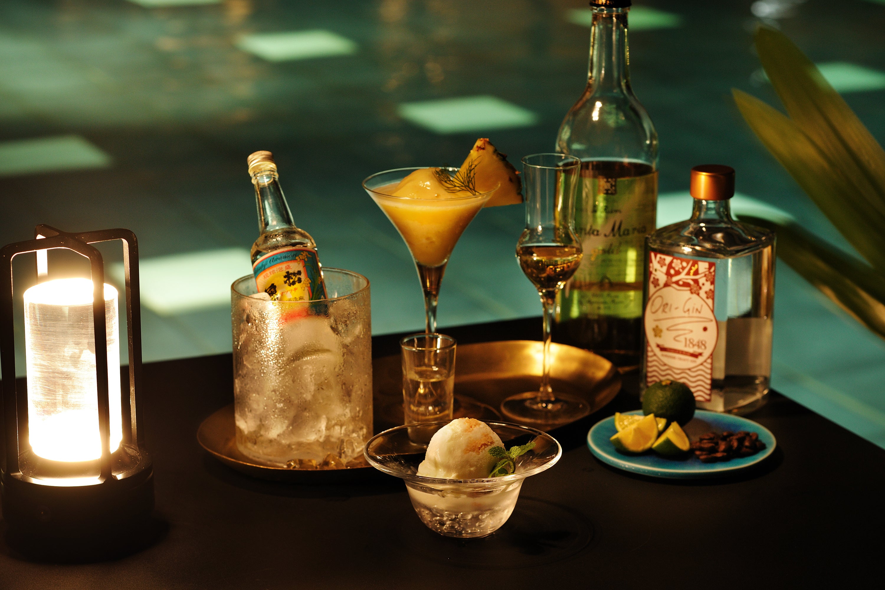 食後酒を楽しむディジェスティフの時間には、泡盛や沖縄の醸造所が作ったジンやラムを使ったドリンクを提供します。泡盛はお酒を半凍結する「パーシャルショット」で味わいます。沖縄で親しまれているカーブチーやピパーチ(*2)を使用したジンはフルーツとあわせてフローズンカクテルに仕上げました。香り豊かなラムはアイスクリームにかけて楽しみます。食後の余韻に浸りながらプールサイドで夏の夜を涼やかに過ごす贅沢な時間です。