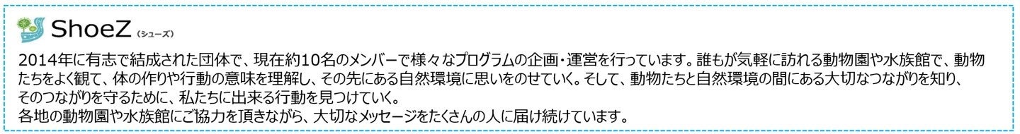 動物や自然環境に関する保全教育プログラムを全国各地で行っている団体「ShoeZ(シューズ)」協力のもと、「いきものキャンパス」を開講します。