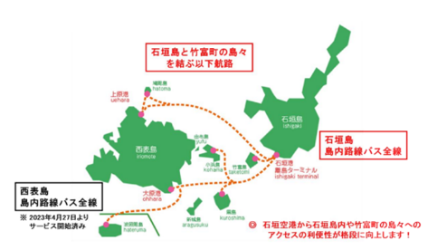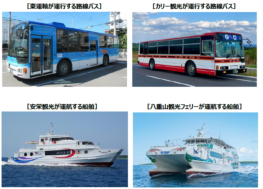 東運輸、西表島交通、カリー観光が運行する路線バス全線、安栄観光、八重山観光フェリーが定期便を運航する全航路