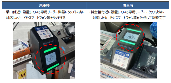 乗降車時それぞれ、車内に設置された専用機器にスマートフォンをかざしていただくことでご利用いただけます。
