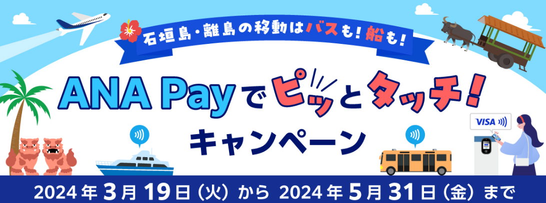 ANA X株式会社(本社:東京都中央区、代表取締役社長 轟木 一博、以下「ANA X」)は、2024年3月19日(火)より沖縄県石垣島を含む八重山エリア全域における移動において、ANAのマイルが使える・貯まるモバイルペイメントサービス「ANA Pay」Visaのタッチ決済で、対象のバスや船舶が利用可能になることをお知らせします*1。それに伴い、同日から5月31日(金)まで「ANA Payでピッとタッチ!キャンペーン」を実施します。