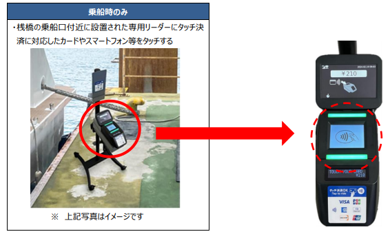 乗船時に桟橋に設置された専用機器にスマートフォンをかざしていただくことでご利用いただけます。