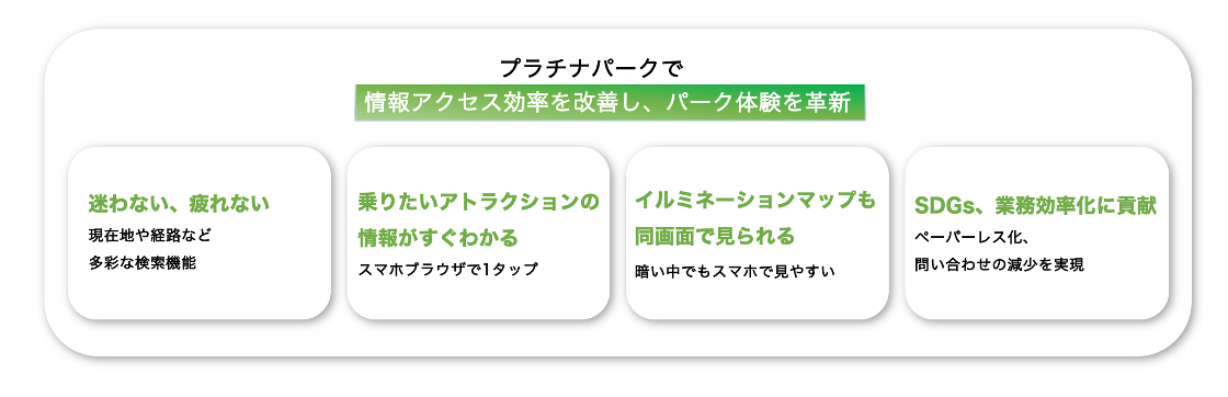 「さがみ湖リゾートプレジャーフォレスト デジタルマップ」はスマートフォンのWEBブラウザからアクセスできるデジタルマップです。「イルミネーションイベントの際、見たいスポットの場所や行き方、イベントの対象エリアがわからず迷った」「看板や紙のマップはデフォルメしてあるので距離感がつかめず、行ってみたら意外と遠くて疲れた」「乗りたいアトラクションがあるが、乗車既定を満たしているかどうかがわかりづらく、現地で聞いたら乗れなかった」といったお客様(来園者)のお困りごとを解決すべく、従来の紙やPDF、看板などの園内マップをデジタル化することで、情報アクセス効率を改善しました。