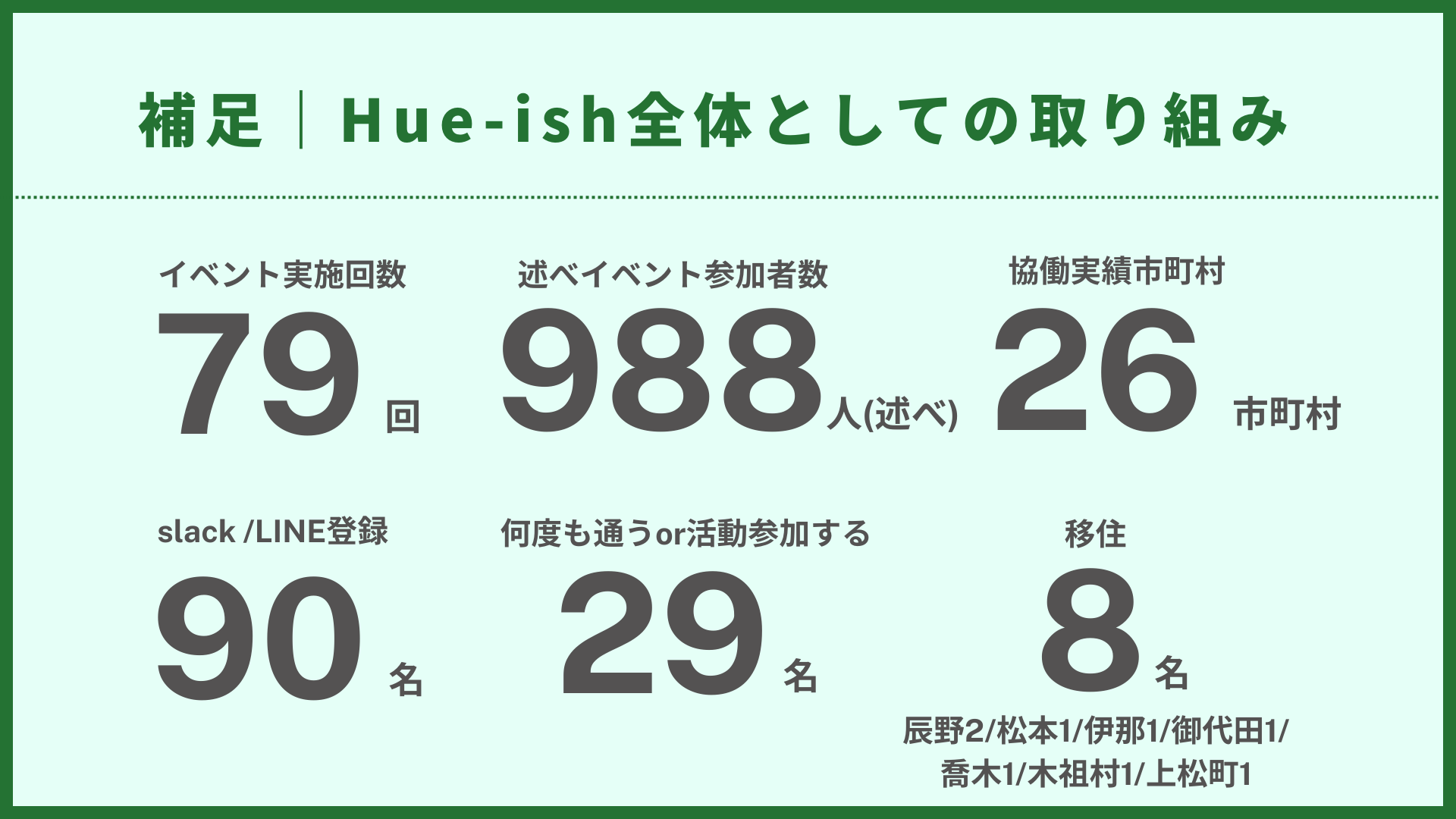 「現在も関係人口創出の取組を進めているが、なかなかつながりが持続しない」、「関係人口創出に取り組みたいが、何からはじめてよいのかわからない」等のお悩みや課題をお持ちの自治体ご担当者様などがいらっしゃれば、ぜひ一度Hue-ish(株)までお問合せください。