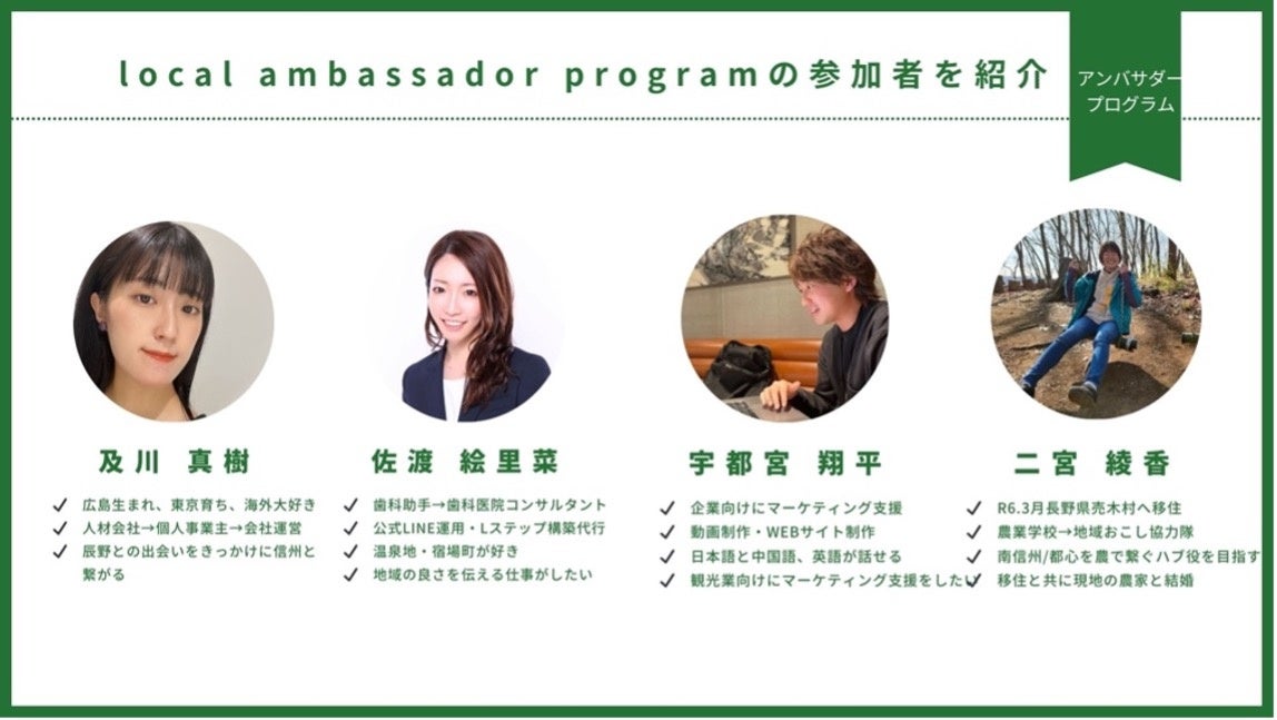 「信州ふるさとアンバサダープログラム」とは、地域と連携しながら首都圏に住む20-30代の若者の関係人口を創出することを目的にスタートしたプログラムです。 “主な拠点を首都圏に構えながらも、地域のプレイヤーと密に関わり、対等なパートナーとして地域のこれからを持続的に共創していく”ことに主眼を置く本プログラムは、令和5年度に28名から応募を受け、面談を経て6名(女性:5名、男性:1名)のアンバサダーが誕生。現在まで約3ヶ月間の活動が行われている。