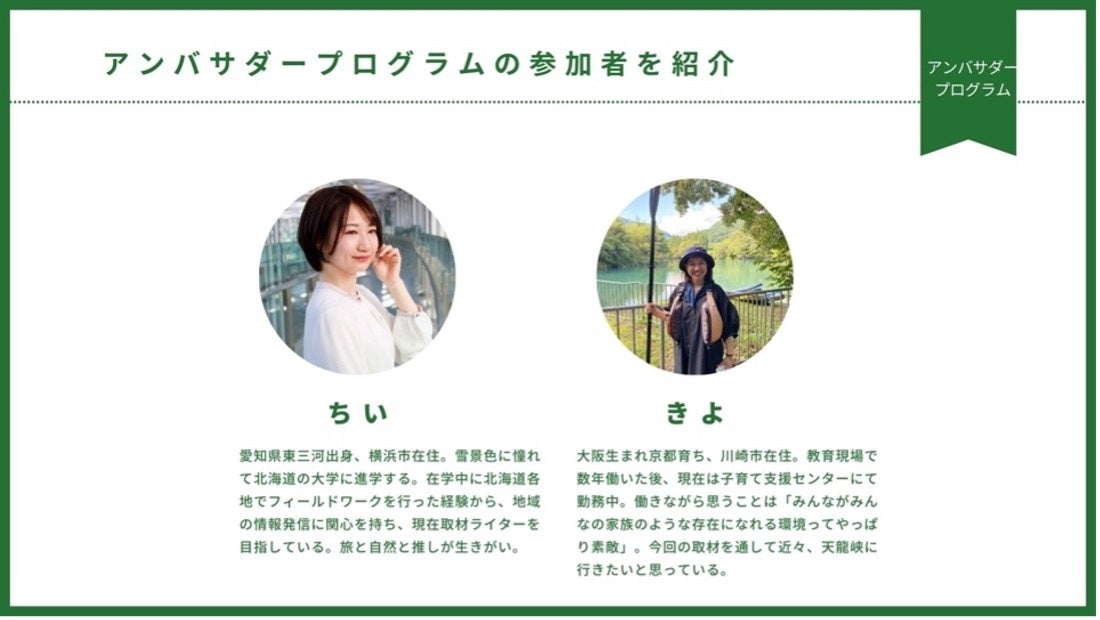 「天龍峡で活動して感じているのは、地域の声はどれだけ発しても届きにくい!同じような地域に埋もれてしまう!今回のアンバサダーきよさんとの出会いは、発信力を劇的に変えてくれました。私の話を自分の使命感を持って聞く力、感じる力、伝える力を最大限発揮してくれた、かけがえの無いパートナーだと思っております。そして一番会いたいヒトです。」