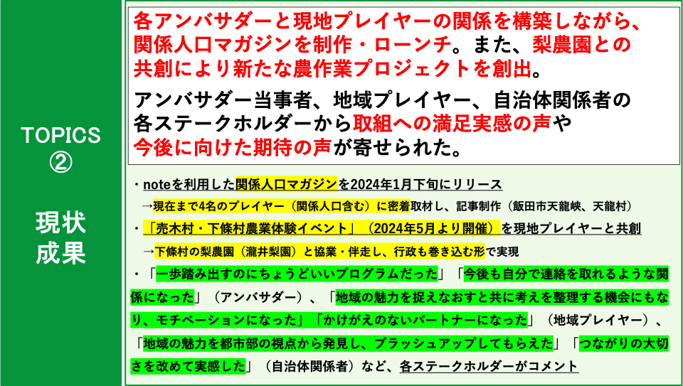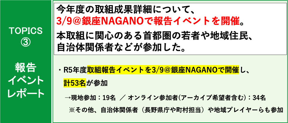 令和5年度の信州ふるさとアンバサダープログラムの活動(約3ヶ月間)について、2つのコース別に現在までに創出された成果を報告いたします。