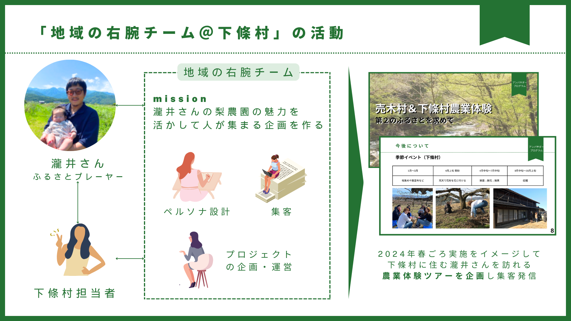 ○地域プレイヤー(瀧井梨園様)と行政(下條村)の架け橋となって、新たに農作業プロジェクト「売木村・下條村農業体験イベント」(2024年5月開催予定)を創出