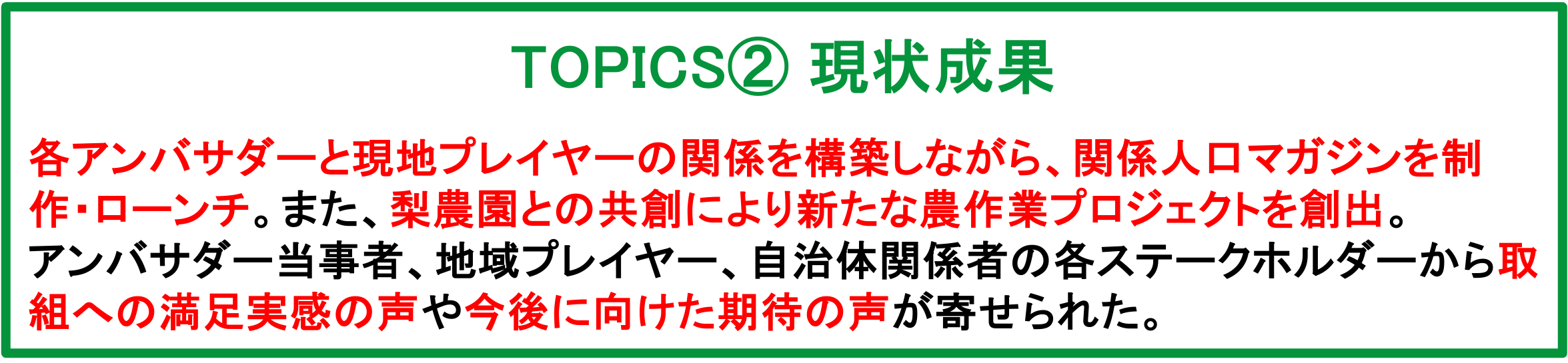 ・自治体ではカバーしきれない地域プレイヤーのお悩みごとや課題をアンバサダー制度で解決していくことで、自治体と地域プレイヤー間など地域内の関係性の向上にもつながる