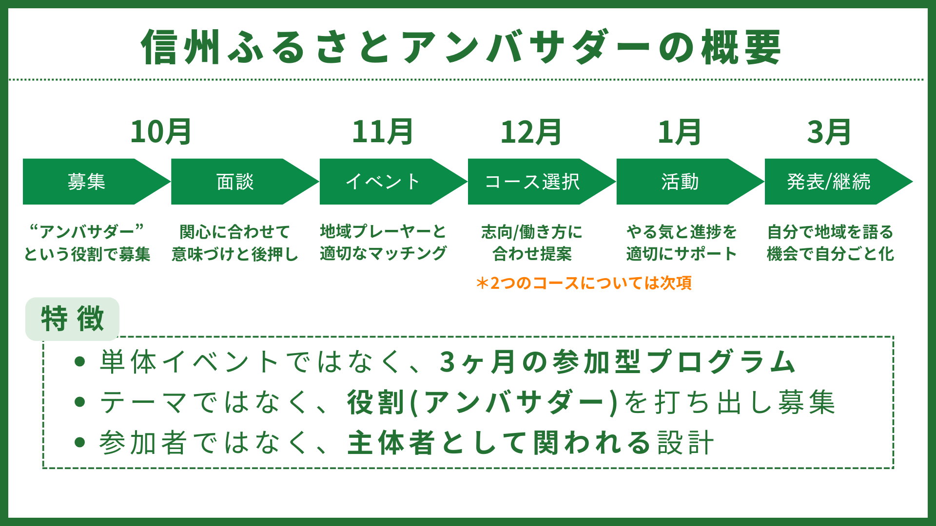 令和5年度は「首都圏の若者が信州の地域プレイヤーの取組支援・魅力発信を行う“アンバサダー”として活動できる、3ヶ月のプログラム」として設計。それぞれコース(チーム)に分かれ、地域で活躍する地域住民の取組を支援・推進している。
