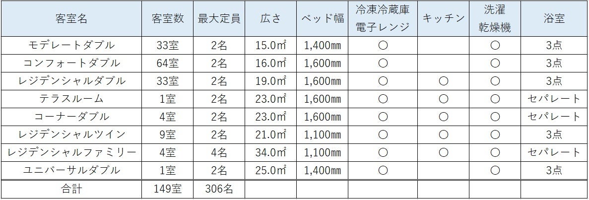 2 ドア冷凍冷蔵庫を完備し滞在機能性をアップ。家族やグループに適したルームタイプも新登場