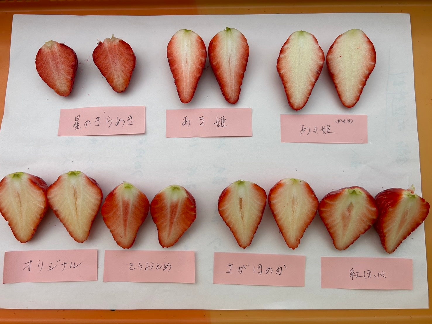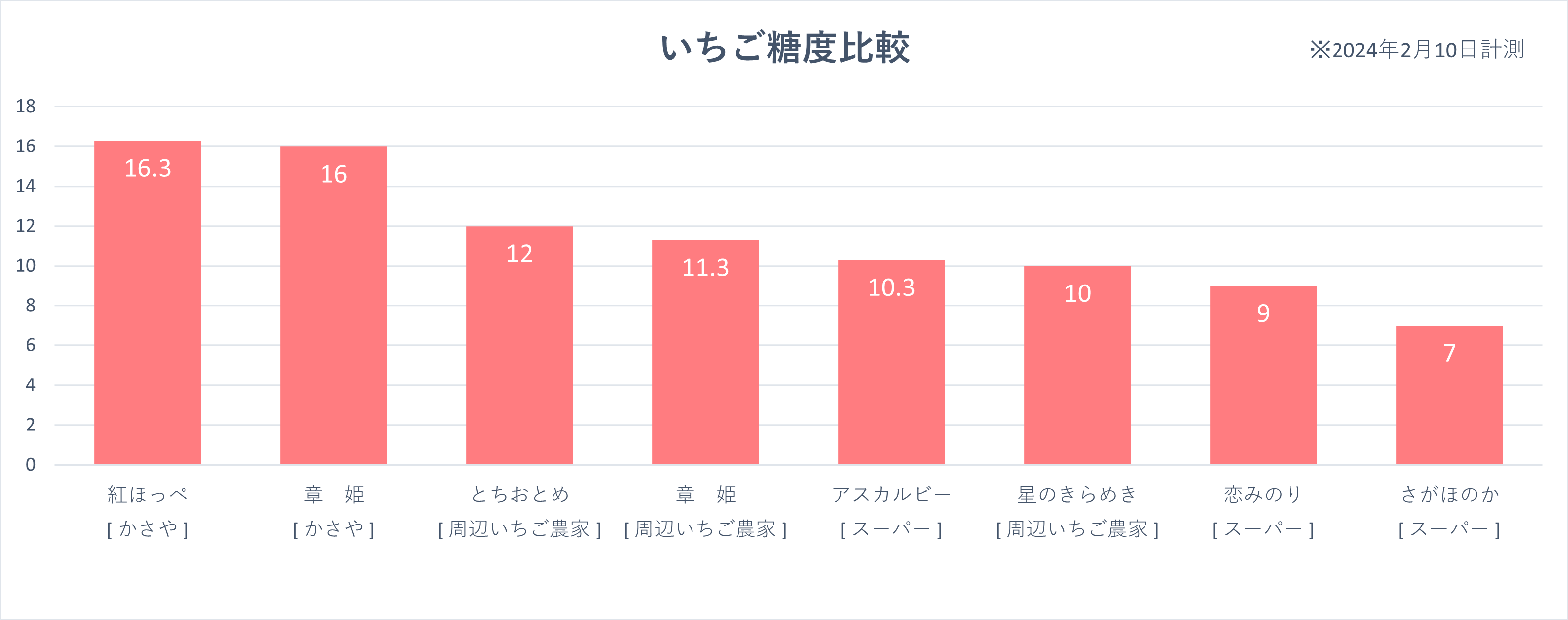 今回はスーパーに並ぶ甘みの強い品種、周辺地域のいちご園の品種等と合わせて糖度を計測して表にしてみました。