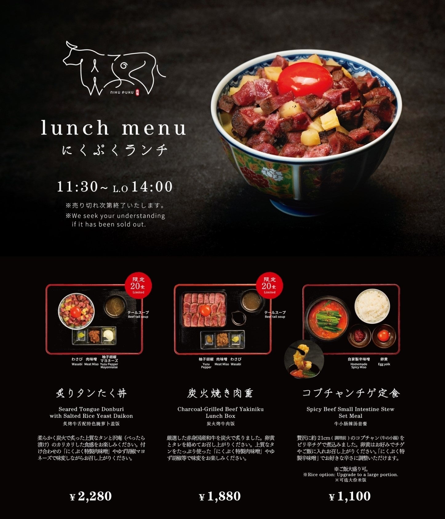 【炭火焼き肉重(限定20食)/炙りタンたく丼(限定20食)/コプチャンチゲ定食】の3種。