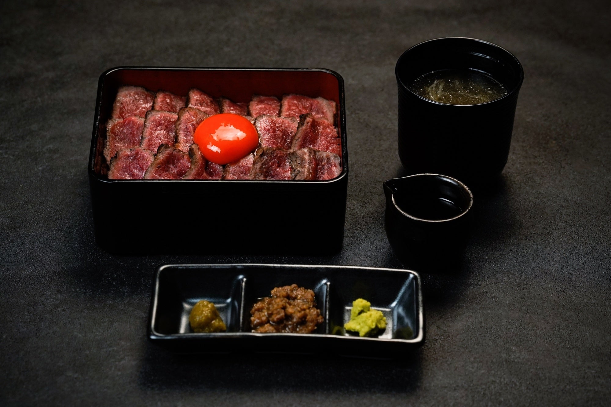 厳選した赤身国産和牛を炭火で炙り、丁寧にスライスし白米の上に並べました。つやつやの卵黄と自家製のタレを一緒に絡めてお召し上がりください。お重に敷き詰められたたっぷりのお肉は、わさび・柚子胡椒でお好みで味変をお楽しみください。