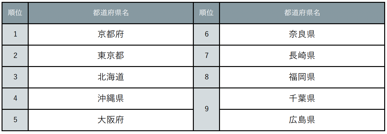 【1位:京都府】圧倒的な得票数を獲得した京都府。「修学旅行で訪れたことがきっかけで」「東京から京都は修学旅行の定番!楽しい思い出がある」「思い出深い場所」など、当時の思い出を重ねながら再度訪れたというエピソードが多数寄せられました。さらに「大人になってまた行きたい場所」というコメントも多く、歴史や文化、四季折々の景観まで、何度訪れても楽しいスポットがたくさんあることも京都府の魅力のようです。