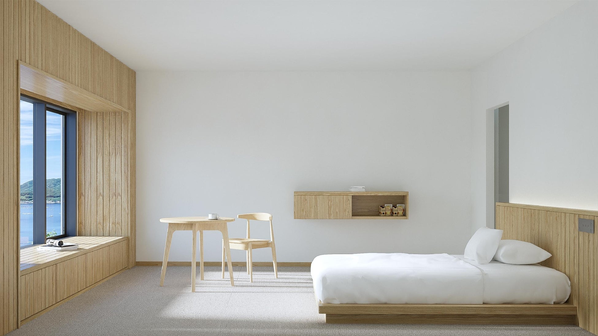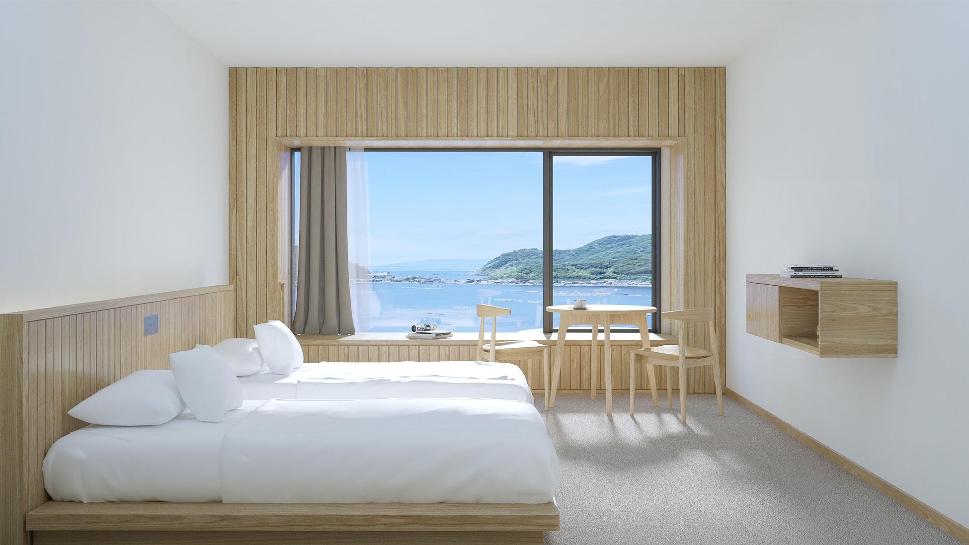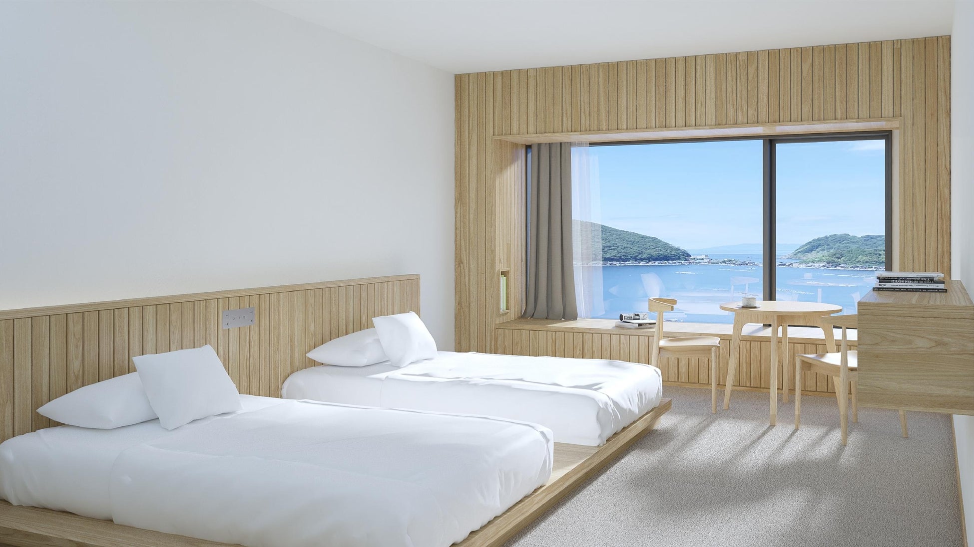 ベッドが窓に近いため、海のそばで寝ているような時間をお楽しみいただける他、窓辺の額縁に腰掛け、隠岐の海を眺めながらゆっくりとお過ごしいただけます。