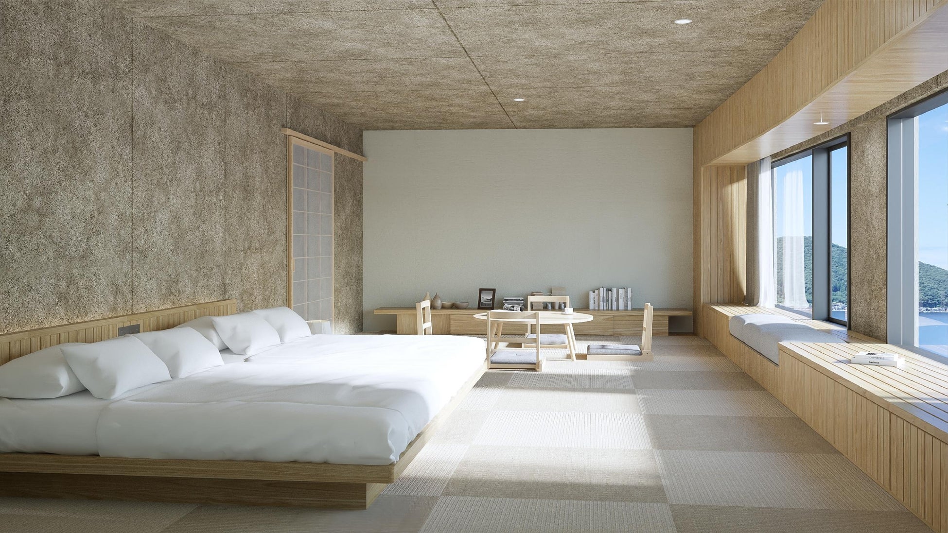 また、すべての客室タイプに、別館NESTと同様に窓に風景の額縁をつくり、室内の明度を抑えることで、豊かな階調を持った隠岐の自然へと意識が導かれる設計を採用。NESTと異なり「額縁」に十分な幅を設けることでそこに座ってくつろぐことができ、あたかも隠岐の風景をうつす一枚の絵の中に入り込むような感覚を味わうことができます。室内の木材にはすべてヒノキを使用し、Entôのコンセプトである【honest】【seamless】を体現する、ぬくもりを感じられる空間へと生まれ変わりました。