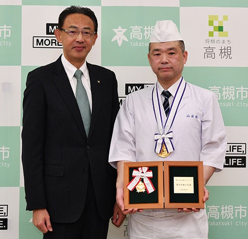 全国から選抜された熟練技能者がこれまで磨き上げた自らの「技能」を披露し日本一を競い合う「第32回技能グランプリ」の日本料理部門で、高槻市の「摂津峡 花の里温泉 山水館」の佐藤学料理長が日本一となる金賞・厚生労働大臣賞を受賞。令和6年3月21日(木曜日)、市役所を訪問し、濱田剛史市長に受賞報告を行いました。