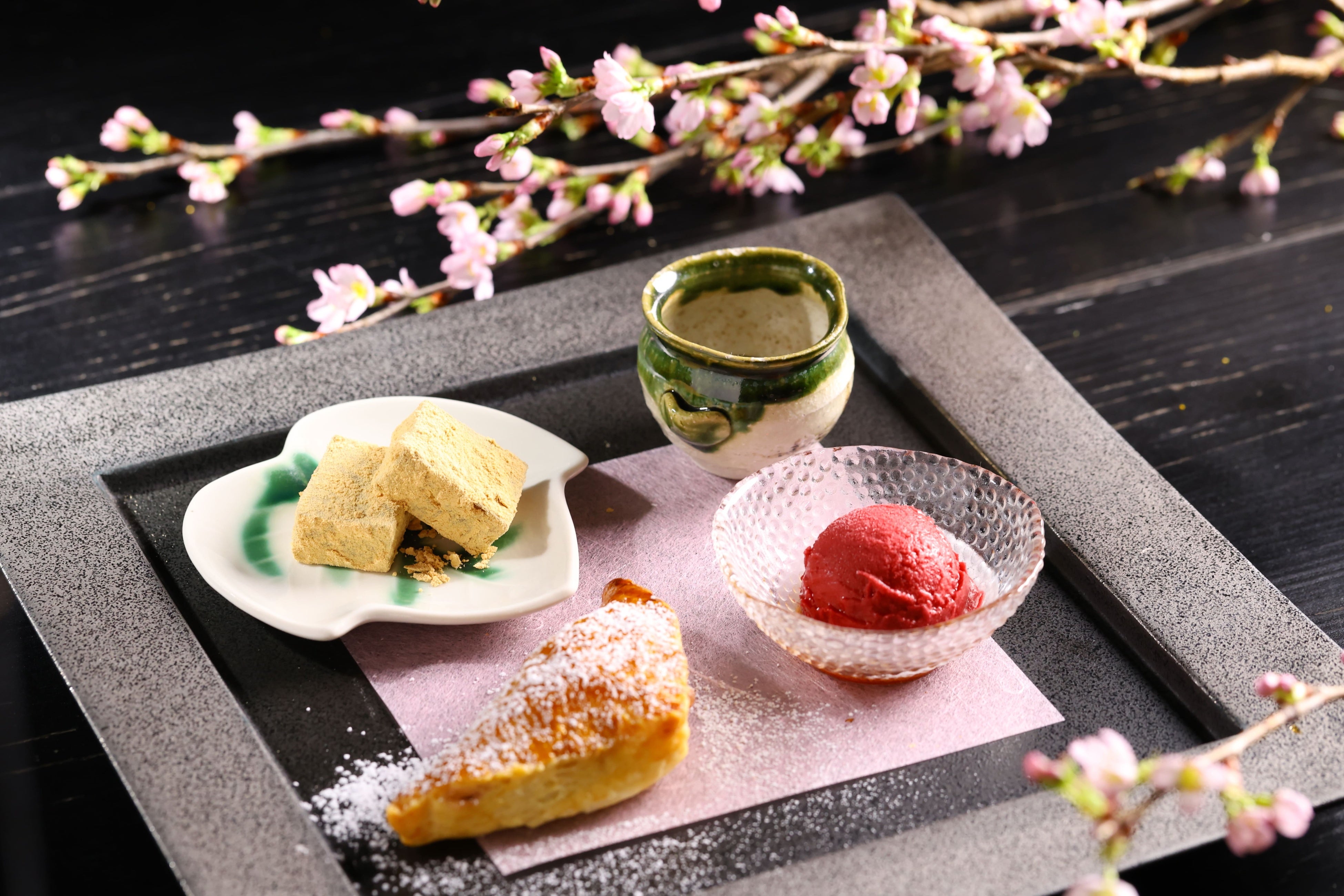◎デザート ~ 桜アップルパイ・すぐりアイス・自家製のわらび餅と黒蜜 ~