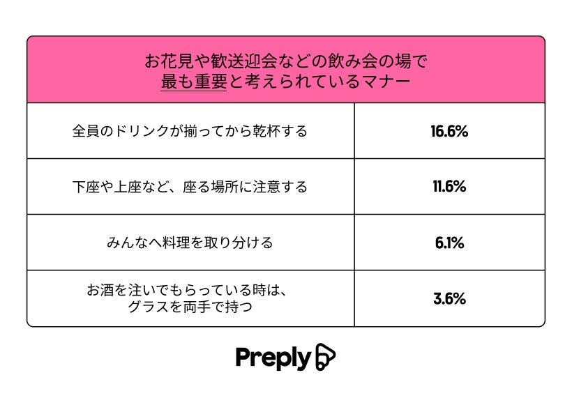 お花見や歓送迎会などの飲み会の場で最も重要と考えられているマナーは「全員のドリンクが揃ってから乾杯する」