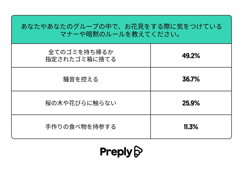 お花見をする際に気をつけているマナーや暗黙のルールについて尋ねたところ、「全てのゴミを持ち帰るかゴミ箱に捨てる」がトップ(49.2%)で、続いて「騒音を控える」(36.7%)が第2位でした。周囲や近隣の住民に配慮しながら、節度をもってお花見を楽しむようにしている人が多いようです。