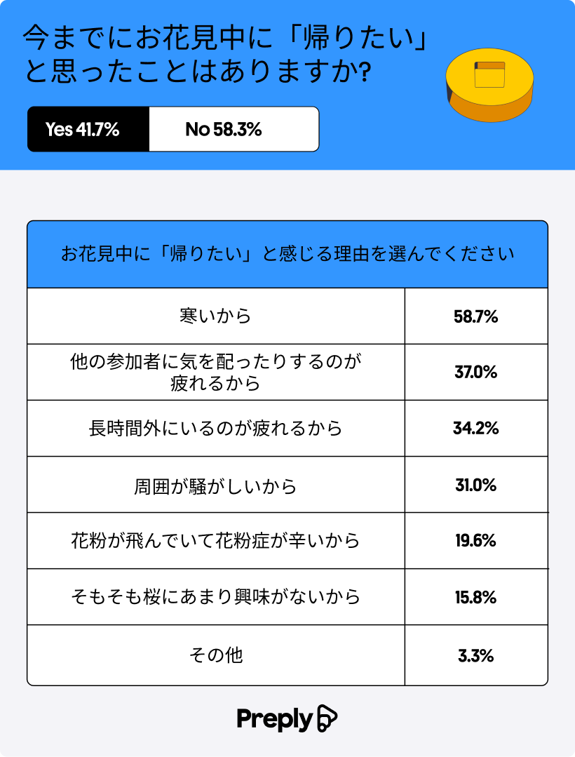 今までお花見中に”帰りたい”と思ったことがある人は41.7%。理由のトップは「寒いから」