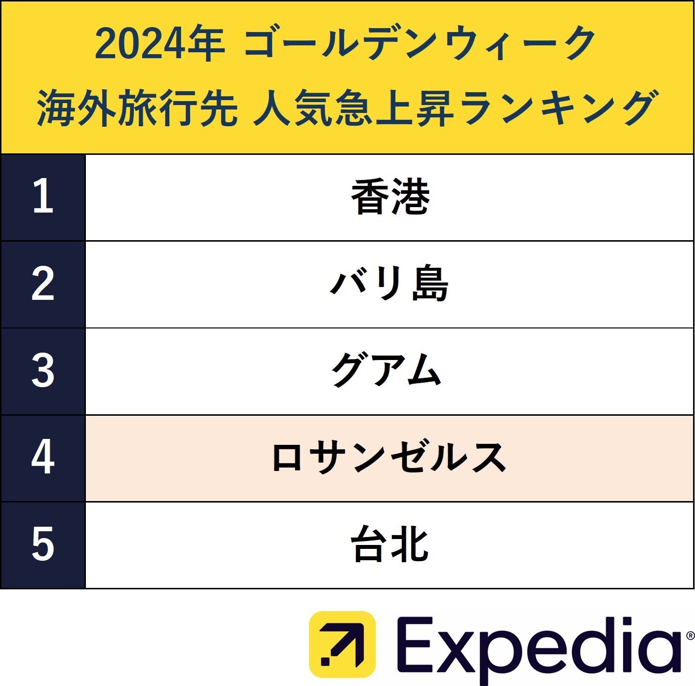昨年と今年のゴールデンウィークの検索数を比較して検索数の伸びが大きい海外旅行先 人気急上昇ランキング※3では、2024年4月から直行便の増便が発表されている「グアム」や、注目の日本人野球選手が在籍するチームの本拠地「ロサンゼルス」などがランクインしました。
