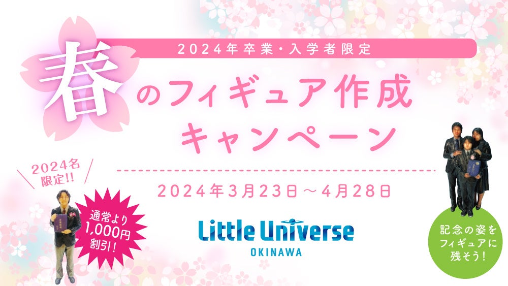 2024年4月29日(月)に沖縄県豊見城市で開業する複合型ミニチュアテーマパーク「Little Universe OKINAWA(リトルユニバース オキナワ)」を運営する株式会社リトルユニバース(沖縄県浦添市、代表取締役:藍川 眞樹)は、2024年3月23日(土)から卒業・入学の記念に自身のフィギュアが通常より1,000円割引で作れるプランを2024年の卒業生・入学生を対象に2,024名限定で発売します。