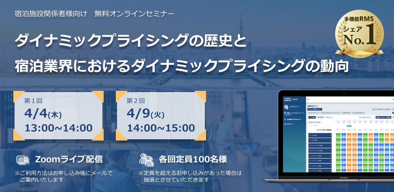 宿泊事業者を中心にダイナミックプライシングシステムを展開し、DXの推進や集客支援を行うメトロエンジン株式会社(本社:東京都品川区、代表取締役CEO:田中良介、以下メトロエンジン)が、2024年4月4日(木)と4月9日(火)の2日程でセミナーを開催し、宿泊業界におけるダイナミックプライシングやその動向について解説いたします。また、宿泊施設向けレベニューマネジメントシステムの機能や導入効果について実際の画面をお見せしながらご紹介し、効果的なレベニューマネジメント手法をお伝えいたします。