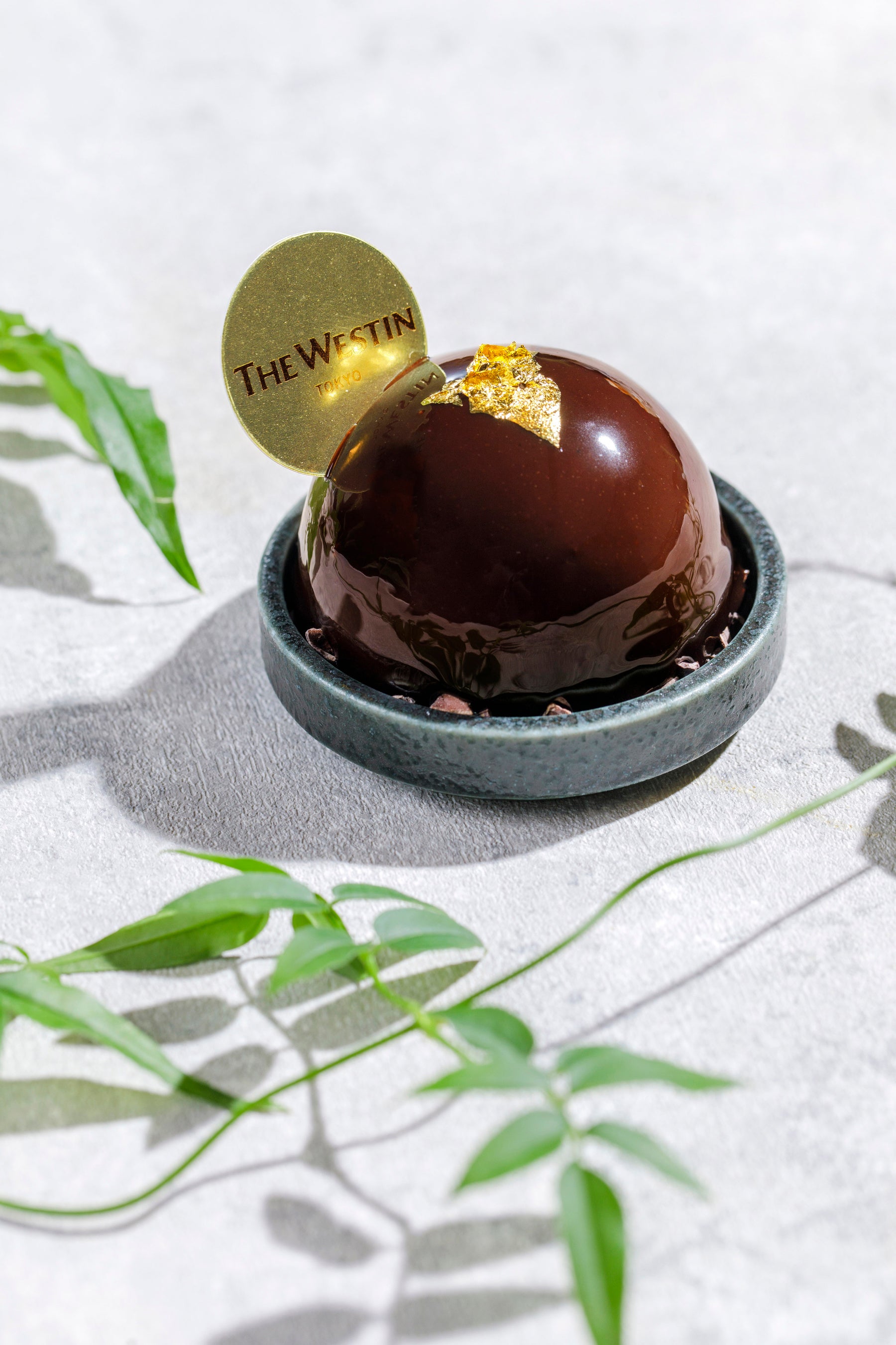 ドーム型の濃厚なチョコレートムースに、酸味あるグリオットチェリーが相性抜群の組み合わせ。口どけの良さを感じていただけます。金箔で華やかに仕上げました。