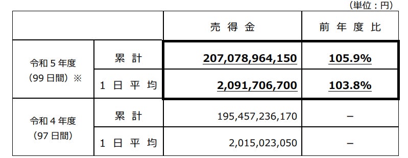 ※これまでの総売得金レコードは195,457,236,170円(令和4年度・97日間)。