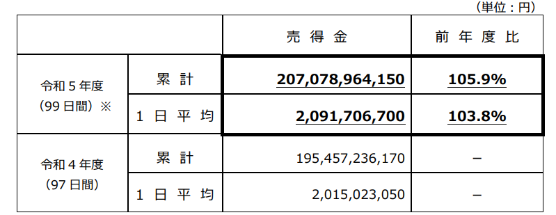 ※これまでの総売得金レコードは195,457,236,170円(令和4年度・97日間)。