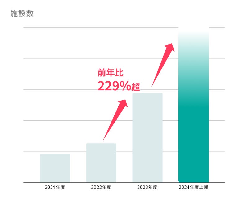 また、施設の運営を無人でしているため、人的リソースの影響が少なく施設を展開でき、施設数は2023年度には前年比229%と急拡大することができ、現在も施設数が増加しております。