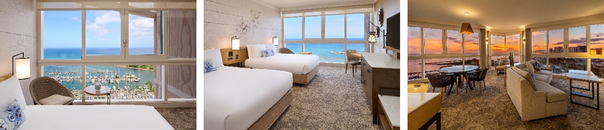 全室オーシャンフロントで、海や砂をイメージした落ち着いたカラーのナイオの花を描いたモダンな雰囲気のお部屋。、ベッドの上でハワイの美しい海を眺めながら、ゆったりとした時間をお過ごしいただけます。また、夕刻にはピンク色に染まる、美しいサンセットをご覧いただだけます。