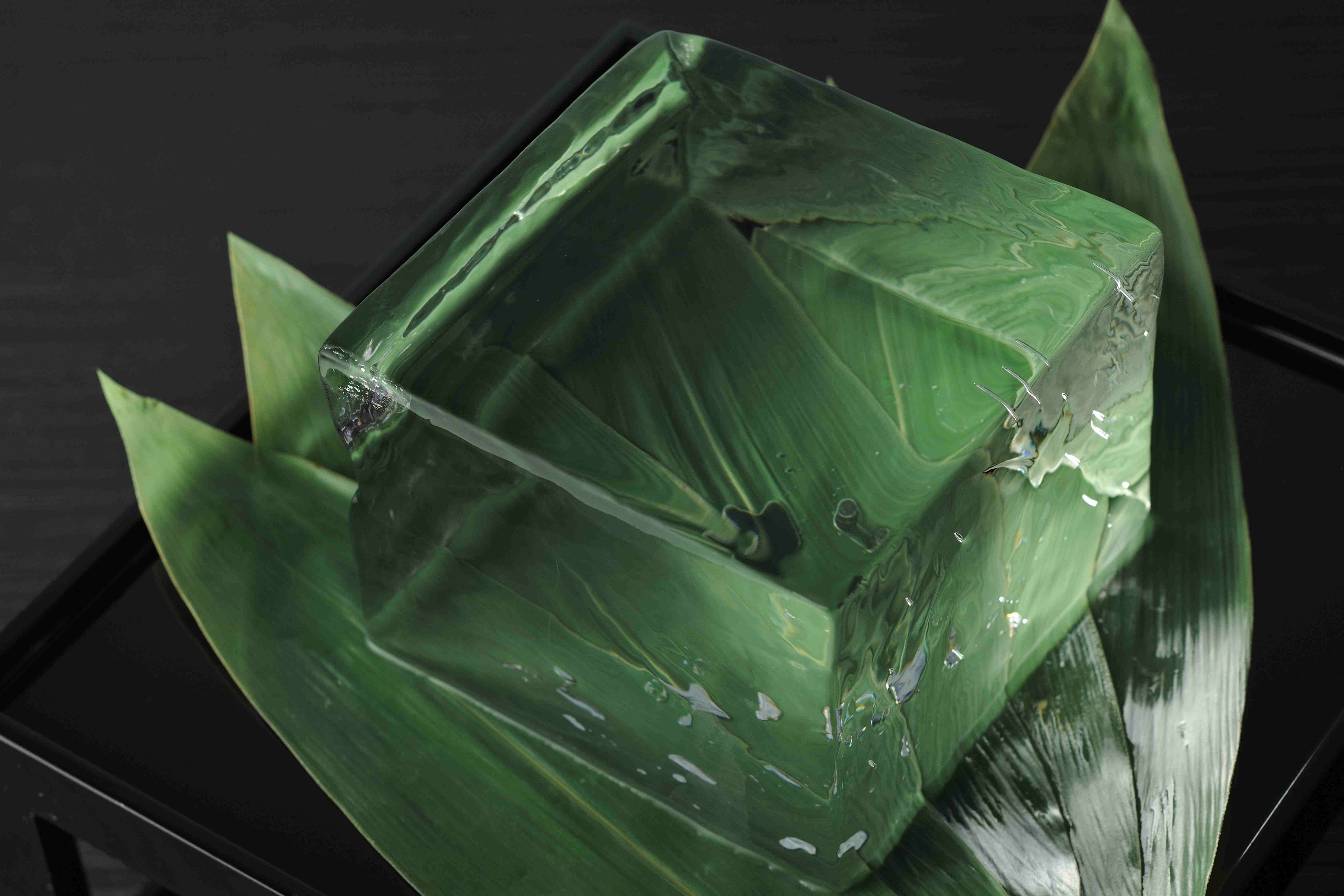 発酵食品と旬の桃をふんだんに使った、10層の異なる食感と香り豊かな味わいが楽しめるかき氷です。江戸時代から親しまれてきた甘酒、どぶろく、みりん、浜納豆(*3)といった発酵食品を使用しています。一番上の層は、甘酒とホワイトチョコレートを合わせたクリームです。ガラスのケースを外すと、このクリームが流れ出す仕立てです。桃は食感を残したまま、熟成みりんを使ってコンポートにしています。底に忍ばせているのは、浜納豆を入れて焼き上げたジェノワーズ(スポンジ生地)です。ほのかな塩味がアクセントとなり、桃の甘味を引き立てます。