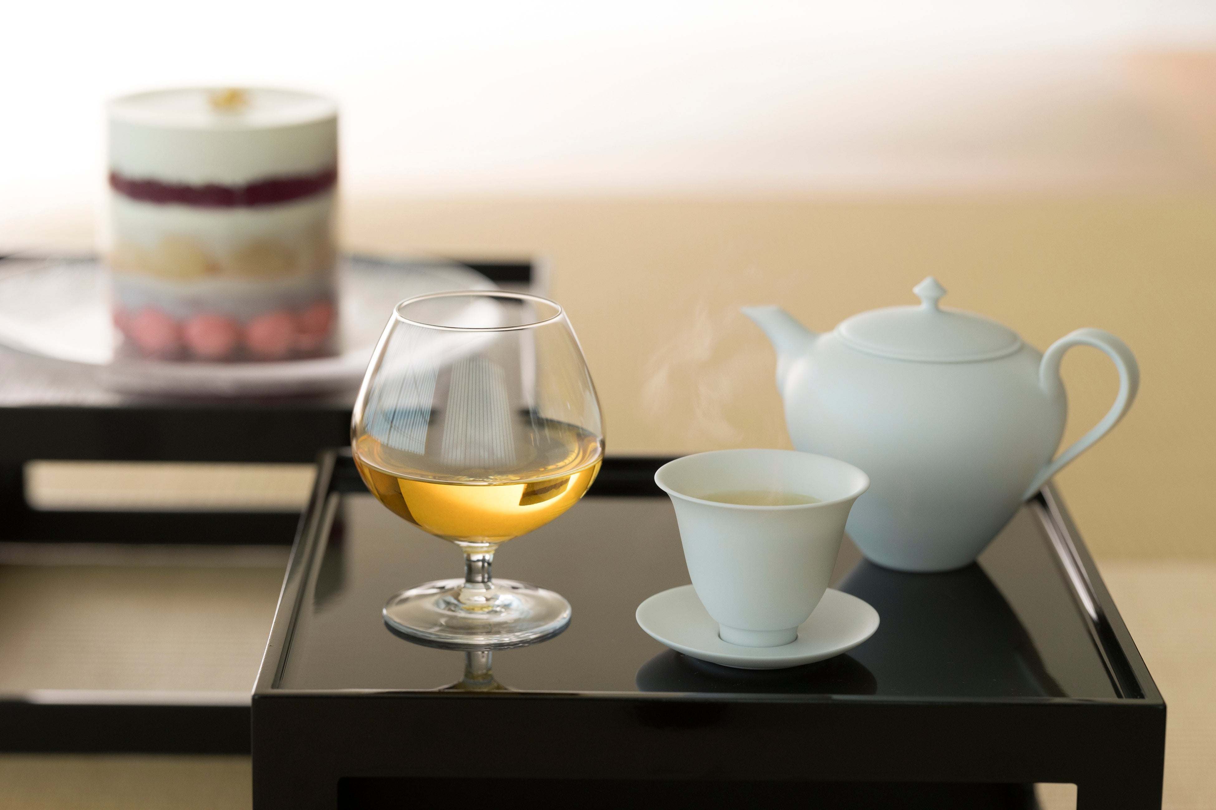 ペアリングさせるのは、小西酒造の「江戸元禄の酒」です。これは、江戸・明治期の酒造りを記録した「酒永代覚帖(さけえいたいおぼえちょう)」を元に、江戸元禄時代に飲まれていたお酒を復元したものです。仕込み水を半分しか使用していないため琥珀色で、米の濃厚な甘みと旨味が甘酒のクリームやどぶろくのムースと合います。この日本酒をお湯割にして、冷たいかき氷と交互に味わいます。食後に提供するのは、江戸幕府が宇治のお茶を好んで献上させていた(*4)ことにちなみ、宇治の煎茶です。甘いかき氷の余韻を楽しみつつ、爽やかな程よい苦味で締めくくります。