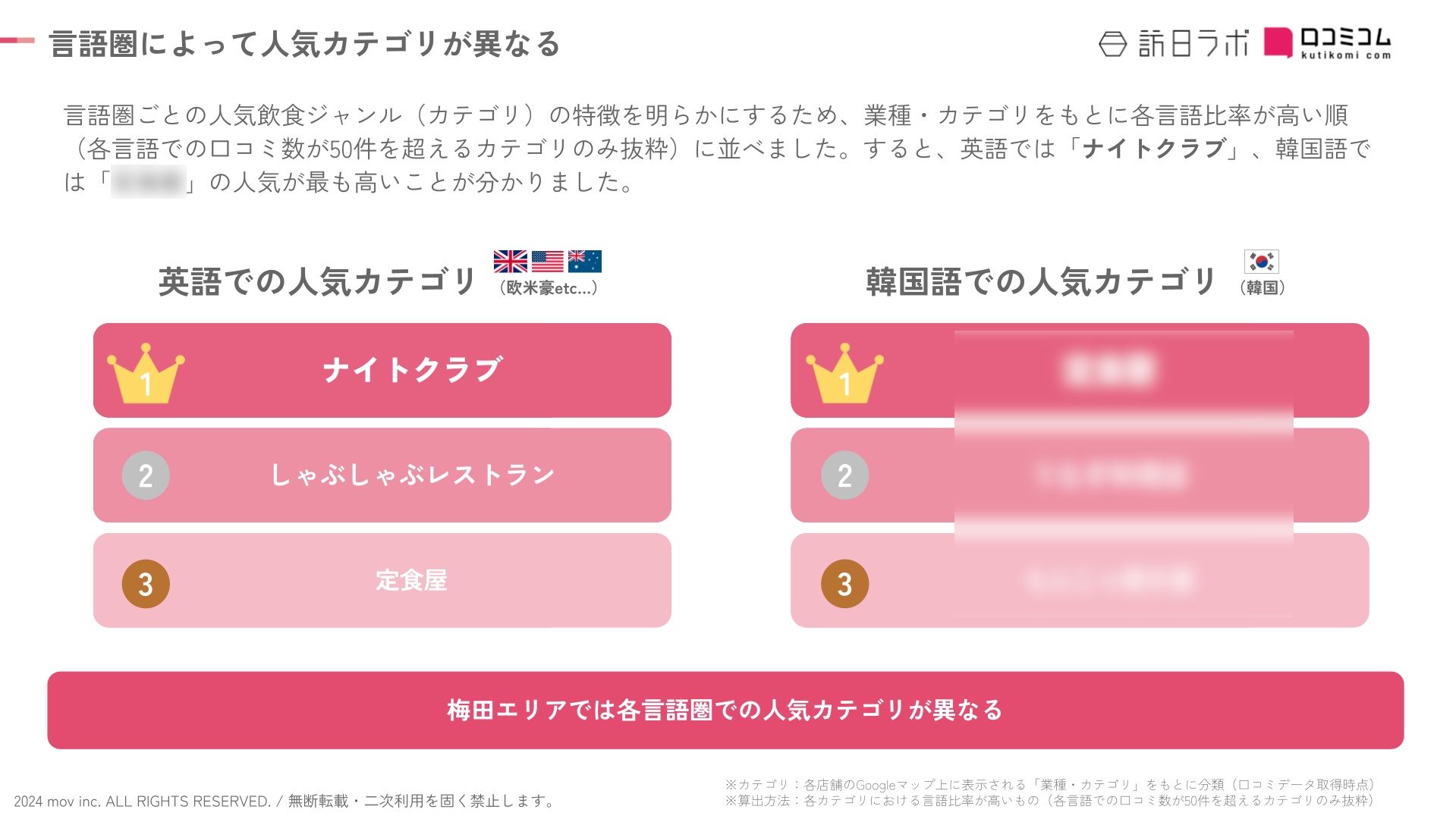 すると、英語では「ナイトクラブ」、韓国語では「◯◯◯◯」の人気が最も高いことが分かりました。