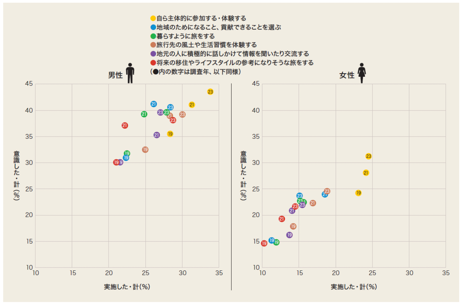 地方移住はコロナで注目度が一気に高まったキーワードだ。新型コロナの感染拡大でリモートワークが普及したことなどもあり、「将来の移住やライフスタイルの参考になりそうな旅をする」ことへの関心が高まっているようだ(意識・計/男性2019年:30.1%→2021年:37.0%→2023年:38.1%、女性2019年:14.7%→2021年:19.3%→2023年:21.7%)。コロナ禍で増加後、2021年→2023年はほぼ横ばいであり、一時的な盛り上がりのように見えるが、実施したポイントを見てみると、2021年→2023年にかけて増加し始めており、地方移住の参考になりそうな旅は実施フェーズに移行しだした兆しを捉えた(実施・計/男性2019年: 21.2%→2021年: 22.2%→2023年: 28.7%、女性2019年: 10.3%→2021年: 12.8%→2023年: 14.5%)。