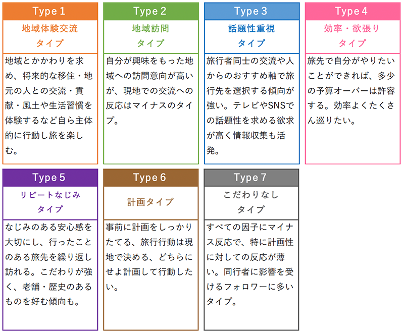 「じゃらん宿泊旅行調査2023」のデータを用いて、クラスターに分類し、そのクラスターを基にZ世代の旅行への意識を分析した。宿泊旅行を行うときに意識したこと、実施したことの質問26項目について「1:意識しなかった」「2:意識したが実施しなかった」「3:意識して、実施した」の3カテゴリに振り直して因子を抽出しそれらの因子への反応をもとに分類したクラスター7タイプの特徴を下記に示す。