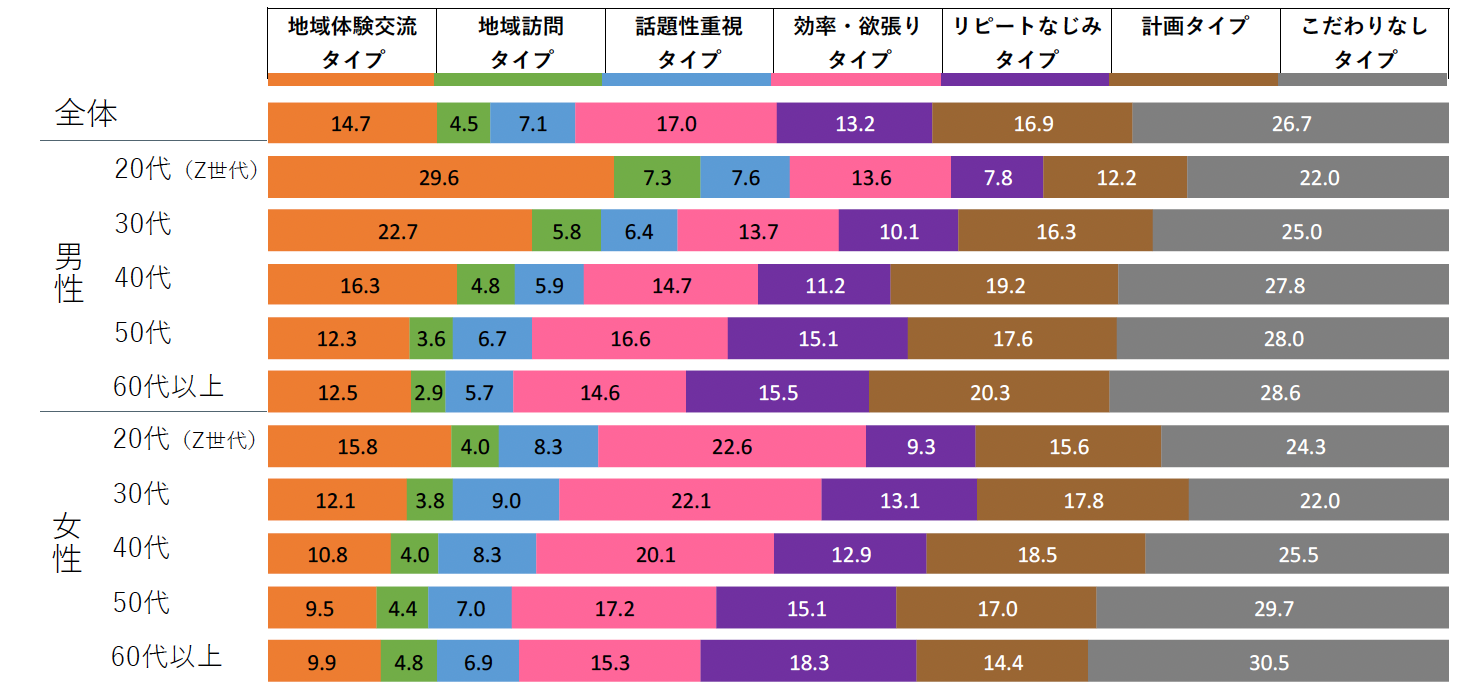 ・このタイプは、効率よくできるだけ多くの場所を回り、新しい場所への好奇心が強いタイプ。計画することを好み、なじみがあるなどリピートすることへの反応はマイナスという特徴を持ち、すべての年代で男性より女性の方が多く、Z世代女性で見ると22.6%でもっとも多いタイプであった。