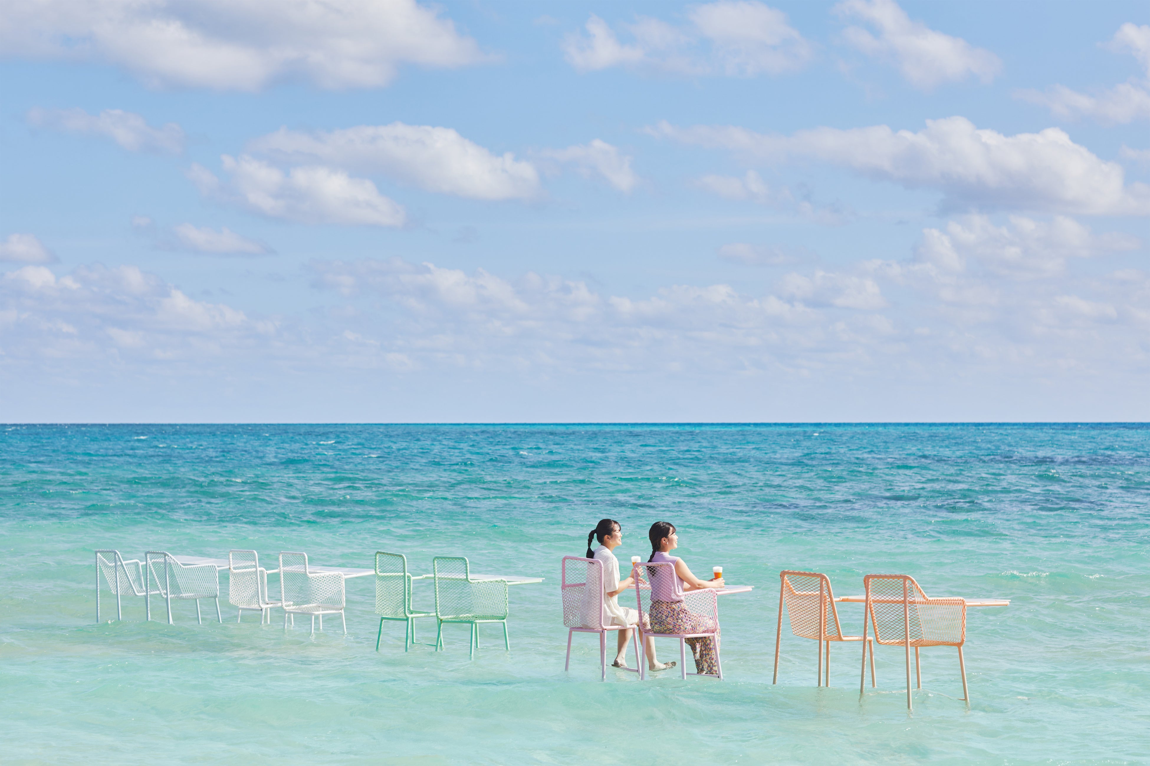 ホテルに隣接するビーチから遠浅の海を歩いた先に、色とりどりの海上カウンター席が登場します。青に染まった世界に浮かび上がる5色の海上カウンター席に腰かけると、心地の良い波の音に包まれ、夏の陽気と歓喜に溢れる気分を一層味わえます。青い海と空に囲まれた至福の時間を過ごすことができる、絶景の特等席です。