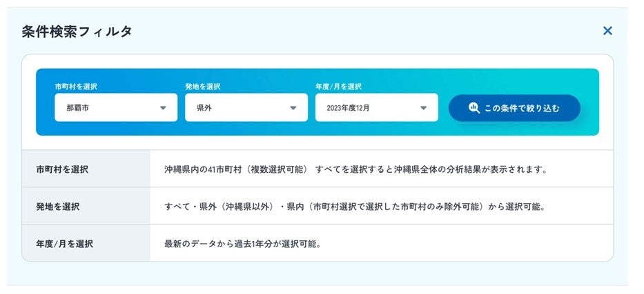 【1】市町村や発地、期間をいつでも選べる共通フィルターを常時設置