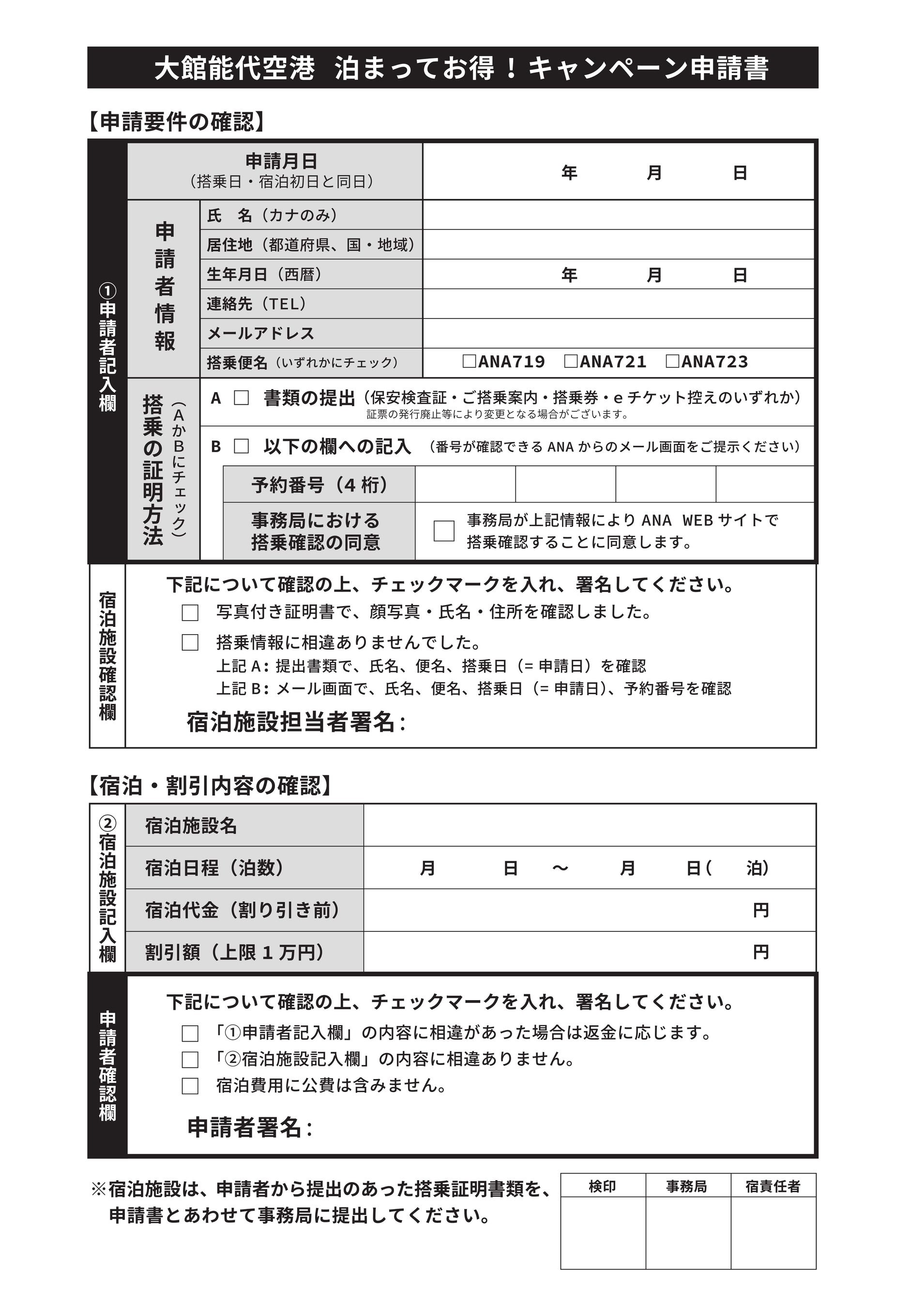 利用方法:申請書に必要事項を記入し宿泊施設へ提出します。